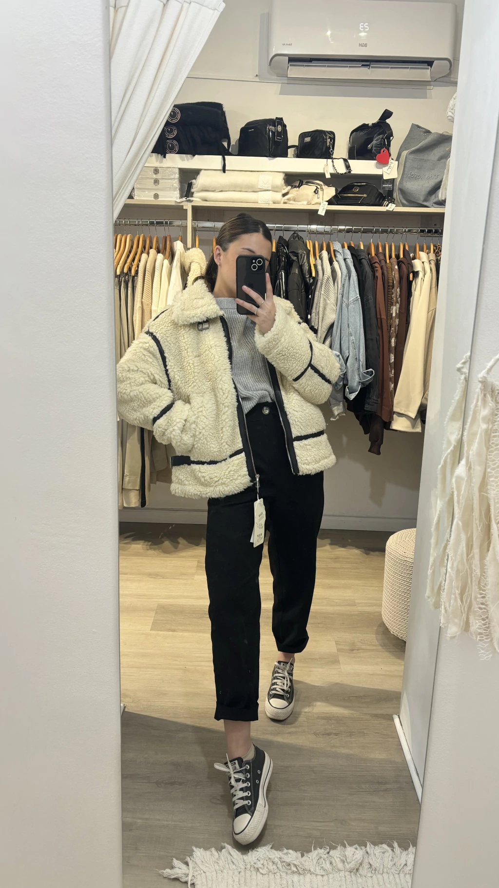 Interior forrado en paño gamuzado negro. Exterior corderito con detalles en ecocuero. Con bolsillos.