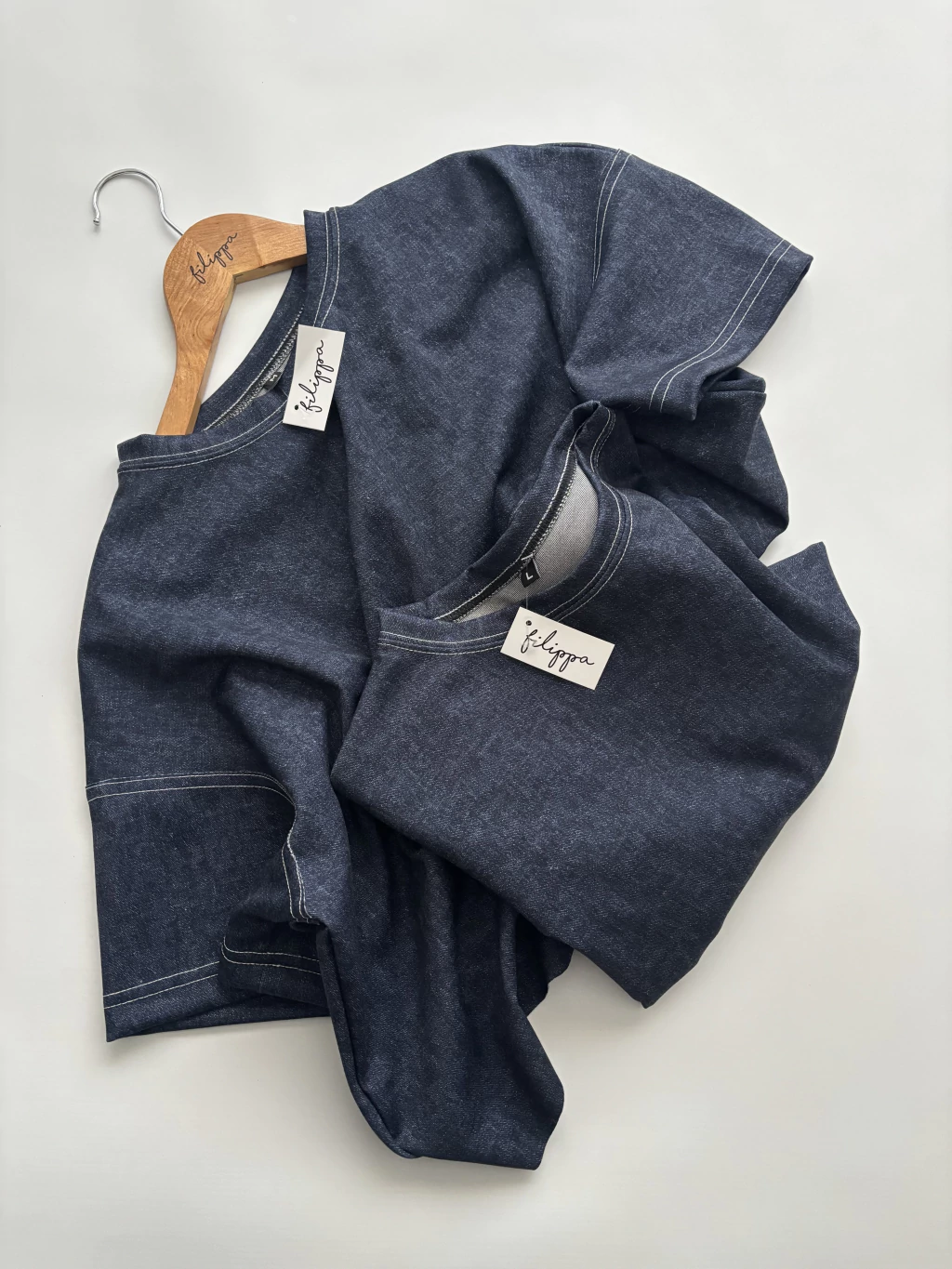 Remera crop top de jersey simil jean con cuello redondo y hombros caídos. Detalle de manga con costuras vistas. Medidas aproximadas.