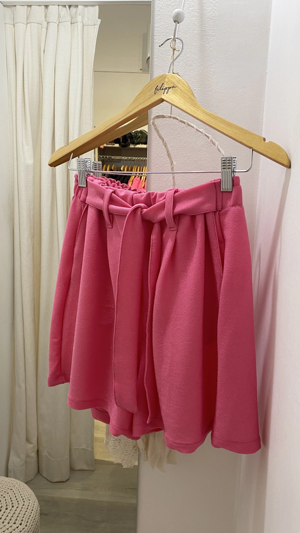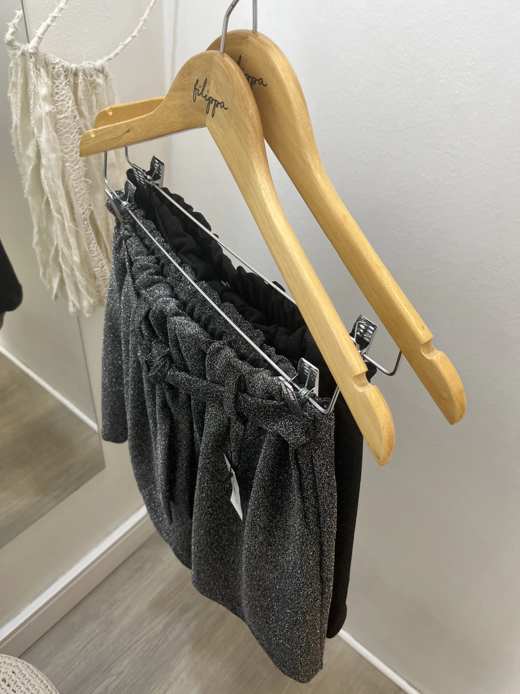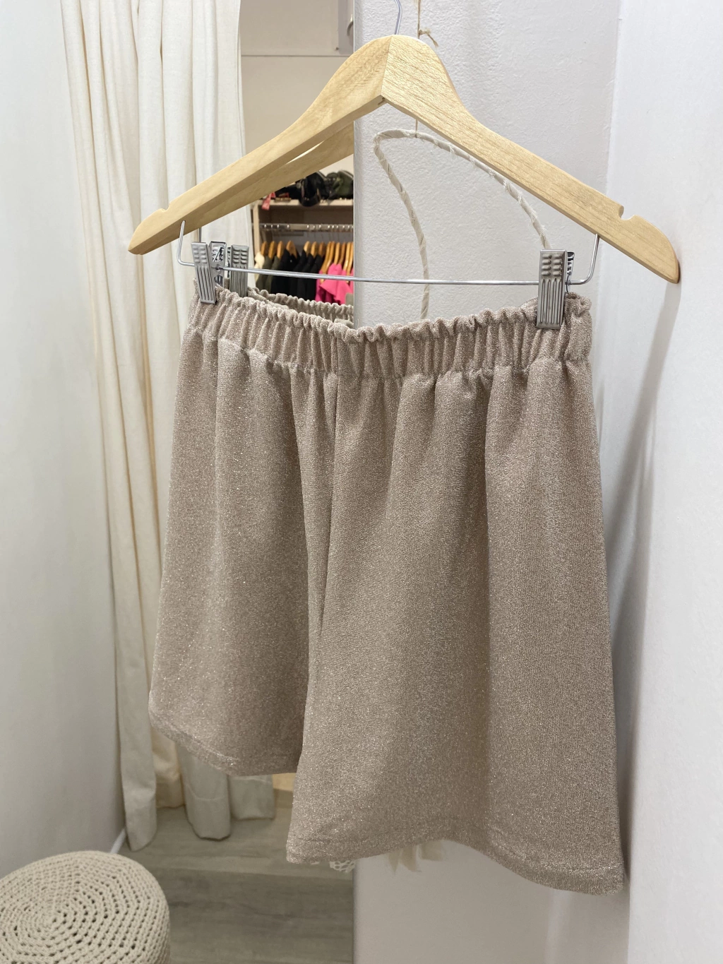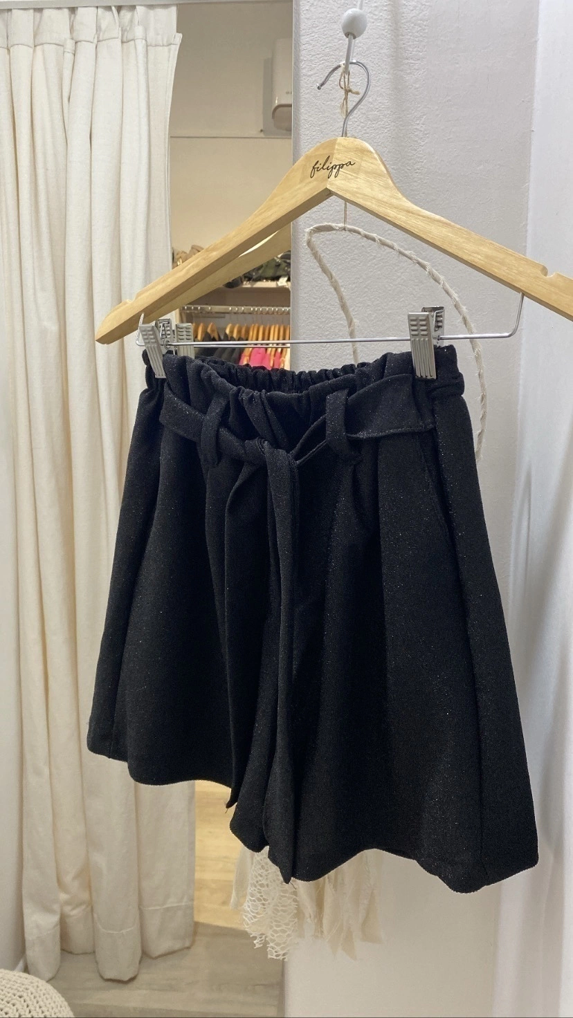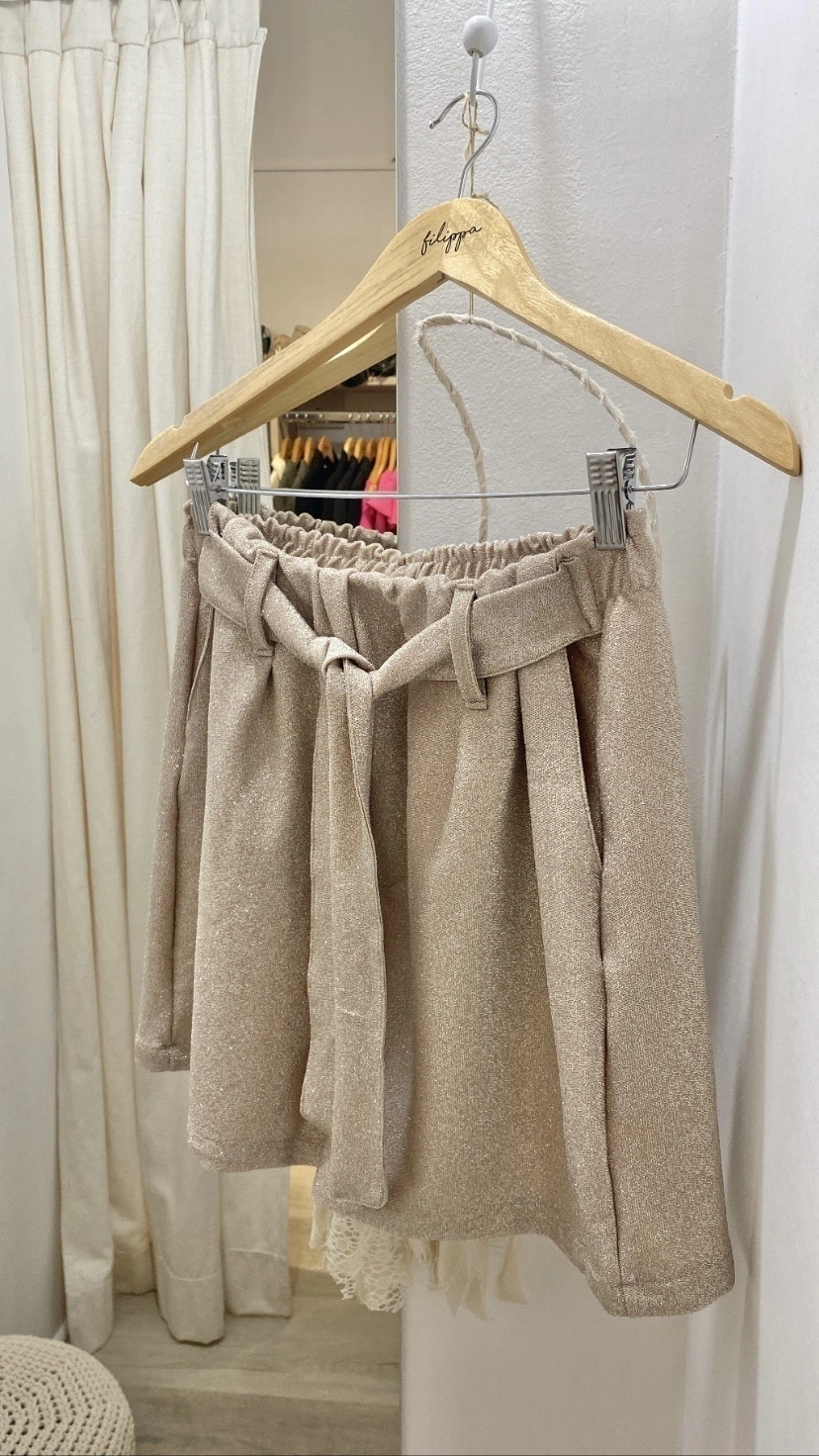 Lurex, con lazo y pasacinto. Con bolsillos adelante. Elastico en cintura. Modelo usa talle 2. Talle 2 Abarca 36/38 aprox. Talle 3 Abarca 40/42 aprox.