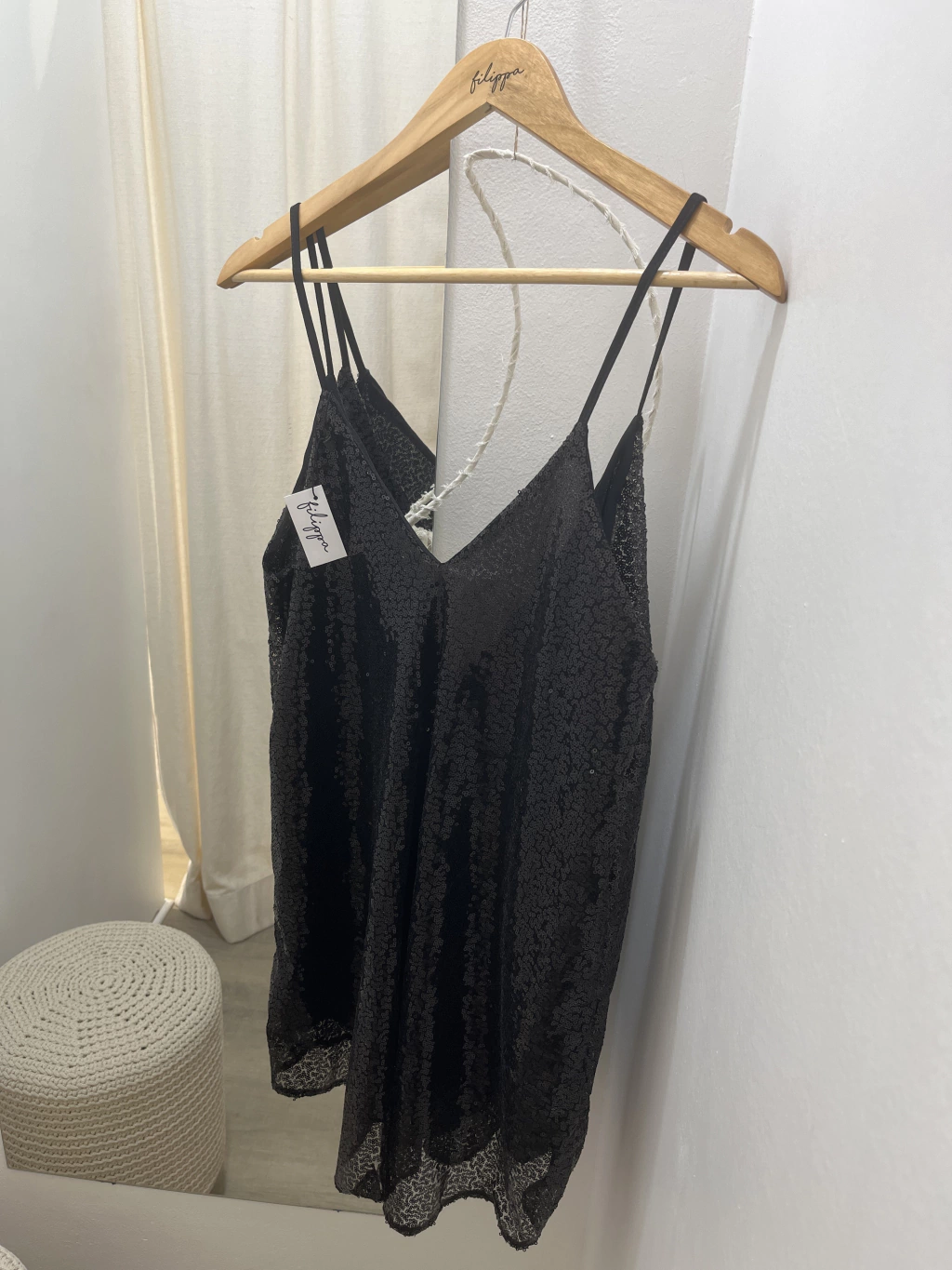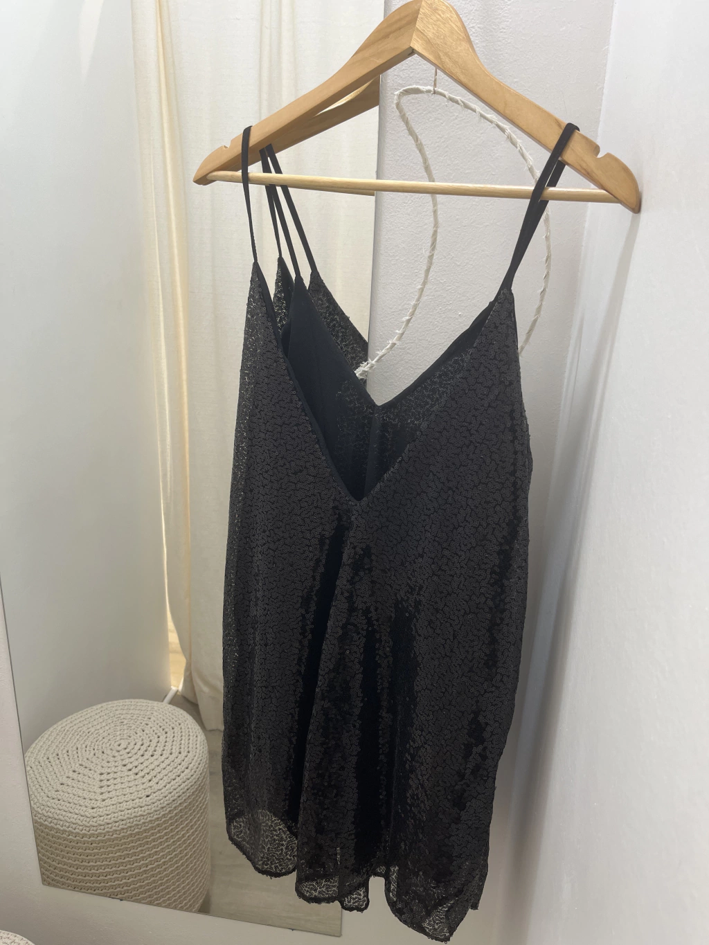 Con lentejuelas. Forrado. 2 ancho busto 46cm, largo 84cm.